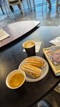 Ставлю 5 звезд: 1) За дизайн 2) За цены Учитывая что заведение находится на территории вокзала, цены порадовали т.к. везде такие заведения заламывают конский ценник. Крем в эклере был на вкус как кусок сливочного масла, поэтому его точно не советую. Кофе в соотношении к цене не лучший из тех что доводилось пробовать. Но учитывая цены и расположение уверен найдете чем заморить червяка перед поездом/электричкой