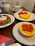 Шли по улице и зацепились за маленькие столики на улице, пёстрые ковры внутри и официантку в милом платье. 🎴Атмосфера. Много ковров и старинной мебели, смешанный в кучу раритет, от старого проигрывателя с пластинками до советских сервизов в виде разинувших рты рыбок. Музыку играет эстрадная, но, увы, не итальянская. 🍳 Еда. Всё в красивой посуде, как ц бабушки в гостях. Порции небольшие, но в целом вкусные. Бенедикт с ветчиной (590 рэ) не подвёл. А по воскресеньям угощают коктейлем мимоза, что добавляет красок в выходной. 💲Цены. В соотношении с порциями - великовато. Голодным не уйдёте, но лёгкое сомнение и вопросы в голове останутся