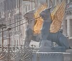 Банковский мост является пешеходным металлическим балочным мостом через канал Грибоедова в Центральном районе Санкт-Петербурга, соединяет Казанский и Спасский острова. Название мост получил по расположенному рядом Ассигнационному банку (ныне в здании располагается Санкт-Петербургский государственный экономический университет). Мост построен в 1825–1826 годах по проекту инженера В. Треттера, является одним из шести мостов «цепного» типа конструкции, построенных в Санкт-Петербурге в 1820-е годы и одним из трех мостов, сохранившихся до нашего времени. Общая длина - 25,42 м, ширина моста - 3,25 м. Покрытие прохожей части - двойной дощатый настил, из шпунтованной доски толщиной 40 мм. Перильное ограждение чугунное художественного литья, представляет собой полукруглые секции с радиально расположенными стержнями, связанными фигурными вставками. У входов на мост на чугунных пьедесталах установлены скульптуры крылатых львов. Крылья грифонов и некоторые детали моста покрыты позолотой. Не проходите мимо и сделайте фото на память с крылатыми львами...