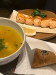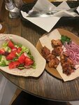 Очень стильно внутри заведения. Заказали люля из баранины, было вкусно. Овощи на гриле подали полу готовые, баклажан и цукини были сырые. За это снимаю звезду. Ну и муж взял самсу с курицей и говядиной, вкусно, но маленькие