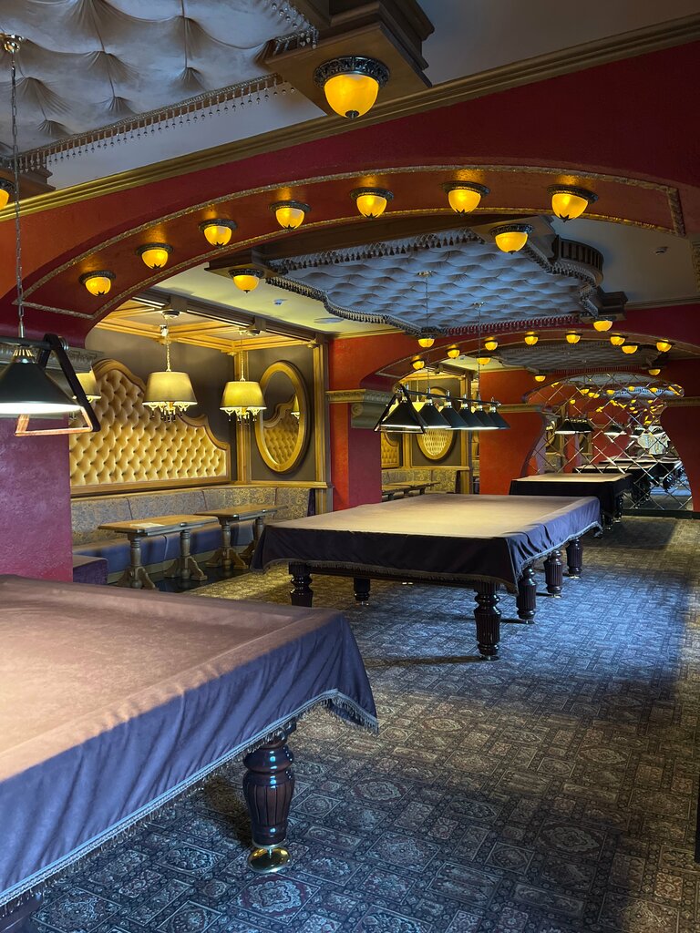 На ресепшене вежливый и все объясняющий молодой человек! Бильярд шикарный! 3 стола, напротив каждого есть место, чтобы вместиться и посидеть большой компанией. Сама атмосфера тоже потрясающая, очень красиво и чисто. Столы, шары и кий в достойном состоянии. Можно к столу заказать закуски/выпивку, но несут ее оооооочень долго. Боулинг уже подуставший. Дорожки неровные, даже кривые я бы сказала, столы старые, где-то сломаны стулья. -1 звезда за боулинг В остальном впечатления отличные. Боулинг/бильярд находятся на территории отеля, отель просто сказка. Если приедем еще, то в следующий раз остановимся уже здесь:)