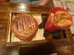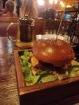 Бургер классический топ! Очень вкусно Атмосфера похожа на пивнуху😀 Официанта не было Никто не встречает Пришлось подходить к бару и звонить в звонок🌚