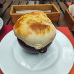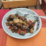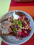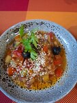 Мы были в кафе. Здесь нужно было идти к кассе, изучать там стоя меню, делать заказ, и только потом можно было занять столик. Заказали теплый салат с баклажанами и кабачками - фото прилагаю, по вкусу было кисло, есть не смогли. Солянка и щи тоже восторга не вызвали, только симпатичная подача щей и вкусная булочка. Для ребенка взяли котлеты, вкус самых настоящих "столовских", но сыну понравилось, а я бы такое есть не стала. Заказали чайник чая , он оказался очень маленьким, на троих еле как хватило. Чем остались удовлетворены - только блинами, заказывали со сгущенкой, было вкусно. Цена я считаю не соответствует качеству в этом кафе.