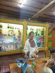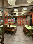 Что хочу сказать об этом месте. Здесь не только кафе, но ещё и магазин сувениров, и какая-то мастерская или музей с мастер классами. Из положительного по кафе отмечу - интересный интерьер, место хватает (примерно 10 столиков), много посетителей, выбор блюд и напитков приличный. Цены также приемлемые, не кусаются. Из минусов, что я заметил (это даже не критика, а пожелание к администрации заведения) - мне кажется, когда много посетителей, персонал не поспевает. Я заказывал солянку - принесли чуть тёплой, разбавил сметаной получился почти холодный суп ( вкус все же нормальный, если бы подогреть). Ещё брал мясное блюдо - скоблянку (мясо с картофелем на сковороде), мясо отлично, а картофель оказался немного сыроват и почти без соли. Официантка она же кассир работала за троих, принимая заказы, разнося еду и убирая посуду, а также рассчитывая клиентов, от чего, как мне показалось, была несколько на нервах. В целом, кафе очень приличное, я думаю, когда не пик посетителей, как сейчас летом, все работает отлично.
