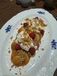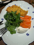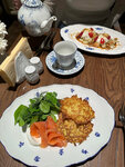 Заказали картофельные драники с лососем, маленькие панкейки с клубникой и карамелью, ванильный раф и чай. Еда и обслуживание 10/10 Чек приятный 🧾 «Минусы» : свет направлен резко вниз, красивое фото сделать будет сложно, так как на лице появляется резкая сильная тень, НО при таком свете получаются идеальные фото блюд ;)