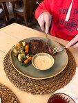 Спасибо за прекрасный ужин. Стейк Рибай был нежным и сочным, ростбиф с соусом приятно порадовал вкусом. Были с собакой и вместе с нами там было еще 5 собак, все вели себя замечательно. Потом еще прогулялись рядом.