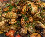 Горячая сковородка с жареными овощами и курочкой на мангале