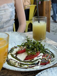 Гуляли по центру и случайно решили заглянуть. Посетили мы данное заведение в пятницу 25.07 вечером. Сели с подругой на веранде. Первое - огорчило отсутствие большей части меню. Я не пью алкоголь и газировки. Соков обычных в ассортименте почти не было, свежевыжатый только апельсин и грейпфрут. Многие позиции из меню также отсутствовали. Хотя вечер пятницы - самое ходовое время. Очень странно. Второе - не было подставки для сумок, пришлось держать на коленках. Это неудобно. Третье - вкус огорчил. Мы выбрали: Хинкали свинина-говядина Хинкали Сырные Салат Капрезадзе Апельсиновый фреш GEO В хинкалях начинки было мало, сырная была почти пустая + мне не отрезали хвостики. Мне объяснили этот тем, что для различия хинкалий - мои отрезать не стали. Хинкали свинина-говядина - мясо внутри оказалось розовым. В капредзе всего 3 кружочка от помидора, даже не целый. В остальном все в норме. Блюда вынесли быстро, в сумме просидели 30 минут. Официант и хостес очень приятные девушки, к ним вопросов нет. Ещё раз сюда точно не приду. Есть с чем сравнить. Соотношение цена/качество для нас лично не соответствует.