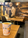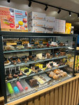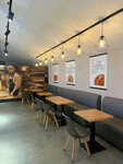 Приятная музыка, вежливый персонал, большой ассортимент выпечки, хлеба, круассанов. Чистый санузел. Взяли капучино, эклер и сочник. Кофе - безумно вкусный. Эклер и сочник - средне, как-то без особого удовольствия ( Стаканчики исключительно бумажные, не для эстетического вкуса.