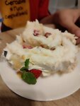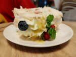Удобное расположение, приятный интерьер, вежливый персонал. Заказ делаете и оплачиваете на кассе, называя номер столика, который выбрали. Здесь можно побаловать себя десертом с напитком или полноценно перекусить. Мы взяли латте, кофейный милкшейк и десерт - меренговый рулет. Все оказалось очень вкусным, нам понравилось! Десерт был в меру сладким с большим количеством свежих фруктов.