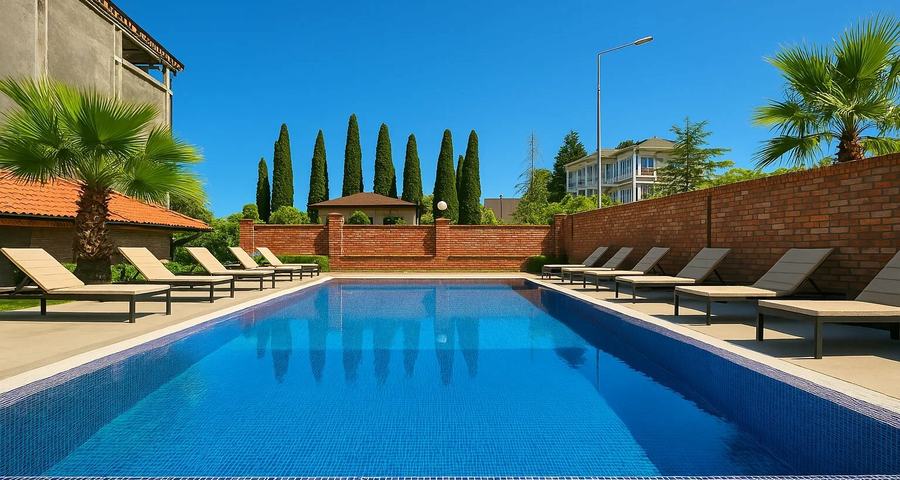 A cozy and modern hotel, located 2 minutes walk from the center and 5 minutes from the sea. Nevertheless, it is calm and quiet here. The surrounding area is beautiful and well maintained. All attractions are within walking distance. For breakfast, they offer simple, familiar dishes: porridge, sausages, fried eggs, vegetables. You can order food for dinner. The food is delicious! The pool is clean and deep! There is a special shallow "tub" built into the common bowl for toddlers. The staff is friendly and helpful! When asking for help, we are always ready to help! Thank you for a wonderful stay!😍