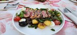 Состав: говядина,соль, перец,кукуруза початок,помидоры черри,салат Айсберг , салат Романо,картофель, брусничный соус, розмарин. 390г.