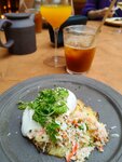 Хостес 5+. Официант на 4. У меня шикарное зрение, но не темен ли путь в уборную? Бифштекс и драник отличный. Удивился что абсолютно безвкусный бамбл. Лепешка пересолена, но правда очень вкусная. Но самые не вкусные были сырники, вкус прогорклого масла и по составу вопросы. Впечатление хорошее, но вернуться пока не хочется