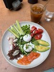 Апдейт отзыва, декабрь 2024. Приехали попробовать основное меню, столик лучше бронировать заранее. Решили попробовать салат и пару горячих блюд и десерт. В итоге до десерта дело не дошло тк уже не осталось места 😆 Сервис как и прежде отличный, официанты все могу подсказать по меню и порекомендовать. В качестве комплимента приносят тыквенное пюре и чипсы (вроде из нори) и хлеб с соленым маслом. Тыквенное пюре как солнышко на столе, мы его очень быстро съели, ибо оч вкусно;)) Мы взяли зеленый салат, муж взял ножку цыпленка, а я форель на бревне (звучит странно, да, но рыба была отличная и действительно подается на кусочке полена). Все было очень вкусно, все блюда правильно сбалансированы. Да, еще между салатом и горячим угощают офигенным сорбетом (на фотке это два ярких шарика;)) ) Да, еще муж пробовал что-то то из баклажана, пассата вроде, тоже вкусно. Интерьер шикарный, какой-то первобытный вайб во всем, от сервировки столика до похода «помыть руки»😆! В целом от нас точно рекомендасьон, но завтраки точно нужно еще доработать, в первый раз осталось противоречивое впечатление (одно фото оставила с завтрака, сэндвич со шпинатом), так что придем их пробовать еще раз через какое-то время;)