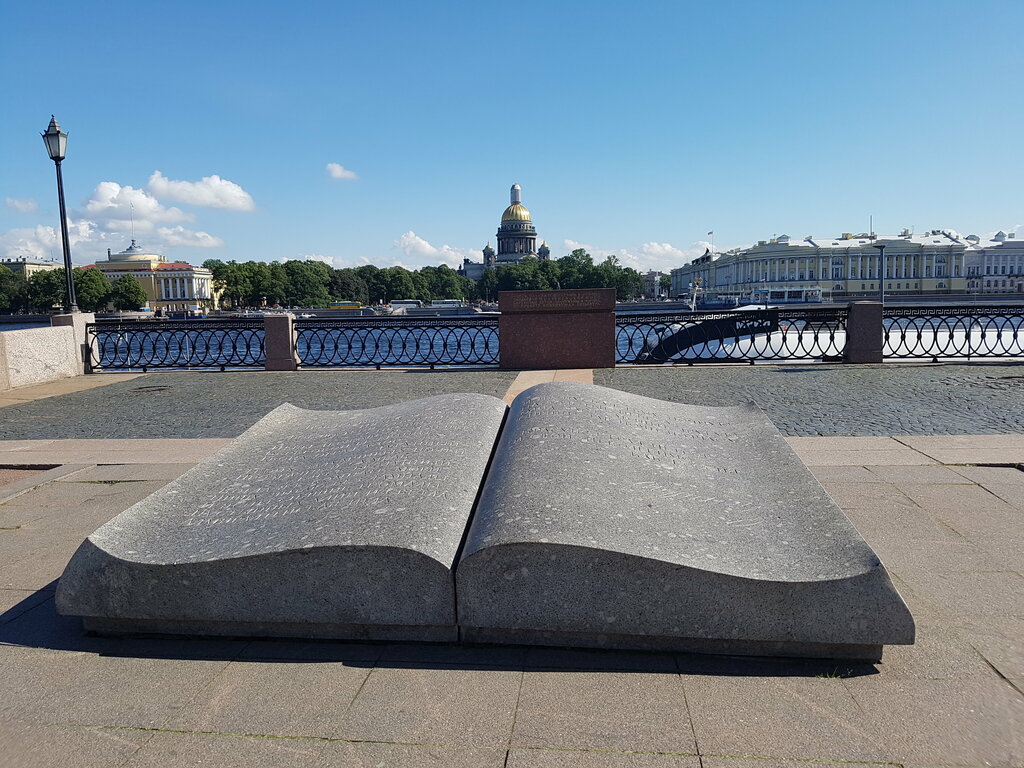 Внушительный гранитный монумент "Послание через века" (2002 год) на Университетской набережной изображает раскрытую книгу размером 2.4 на 3.6 метра. На раскрытых страницах выбит фрагмент поэмы А. С. Пушкина «Медный всадник».