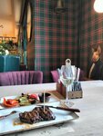 Стейки приносят на выбор в сыром виде. Сама выбираешь понравившийся кусок. В меню цена за 100г. Кусок от 200 до полкило. Ну и цена готового блюда соответственно возрастает. У меня получилось порядка 7К за рибай, салат капрезе и вино. Так что, экономным кавалерам, которые не готовы платить за дам, - не сюда). Интерьер под классический английский паб 18 века. Однако просторно, зелено. Если хочется столик у окна с видом на Волгу и диванчиками, так и говорите при заказе. Иначе будете сидеть на диванчиках у окна, но с видом на стену соседнего дома). Официанты приветливы, профессионально вовремя доливают вино, но не навязчивы. Подача блюд достаточно быстрая. Туалеты чистые. Меню качественное. По ценам - заметно выше среднего. Локация - через дорогу променад, набережная, гуляй, как говорится, не хочу! Рекомендую. Минусов, глобально портящих впечатление, не нашла.