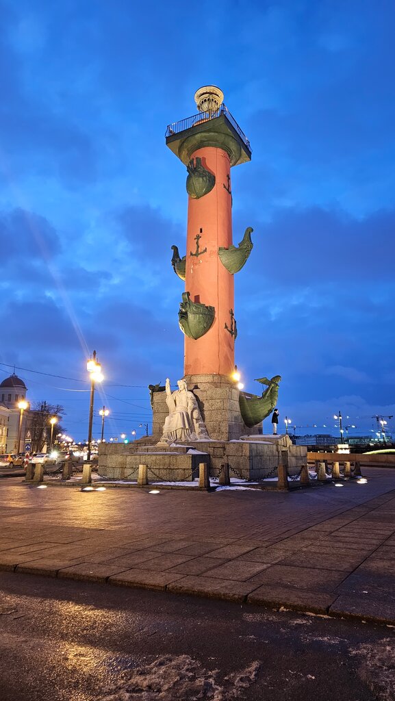 Ростральные колонны — это впечатляющее архитектурное сооружение, расположенное в центре Санкт-Петербурга. Они представляют собой две высокие колонны, украшенные носами кораблей (рострами), которые символизируют морские победы России. Колонны стоят на стрелке Васильевского острова, откуда открывается потрясающий вид на Неву и исторический центр города. Это одно из самых популярных мест для прогулок и фотосессий. Поднявшись на колоннаду, можно полюбоваться панорамой Петропавловской крепости, Зимнего дворца, Адмиралтейства и других достопримечательностей. Вечером, когда зажигаются огни, вид становится особенно романтичным. Кроме того, с колоннады доносится звон колокола, который можно услышать в определенные часы. Это добавляет месту особую атмосферу. Прогуливаясь рядом с Ростральными колоннами, можно также насладиться шумом Невы, почувствовать дыхание истории и ощутить величие северной столицы