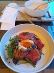 Заказал борщ и салат с мясом Борщ на 5: подача хорошая (борщ, сметана, два маленьких кусочка хлева с мелко нарубленным салом) вкус хороший слегка в кислинку (как и должно быть), цвет хороший и яркий. Салат на 4: подача хорошая и интересная, слегка непонятно зачем мясом накрывать яйцо пашот. Мясо в палате не внятное и показалось сырым..