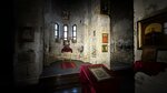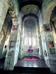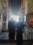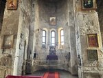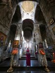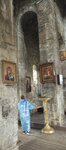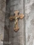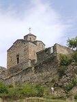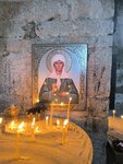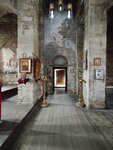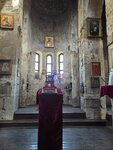 Храм максимально строгий, даже не штукатурен. И выше всех мирян. В том храме как бы никого нет. И даже нет подсобных помещений. Храм на скале, вокруг обрывы. В притворе на столе лежат свечи по ранжиру, рядом ящик с прорезью для денег. Правда металлическией и запертый. В зале старинные иконы просто стоят на столике - такая демонстративная вера в честность прихожан. По-кавказски. Но когда я сходил к колокольне и вернулся, многих свечей в паникадиле не было. Остались две свечи, которые я ставил. И никого нет! Оставляет хорошее впечатление, потом хочется туда вернуться.
