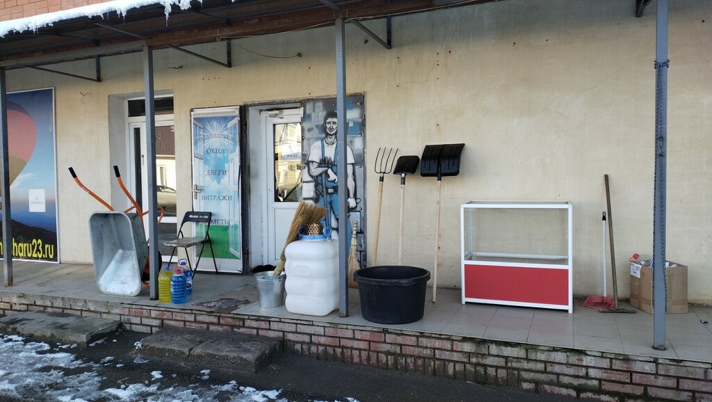 Маленький, тёмный магазинчик. Выбор скудный: несколько видов крепежа, красок, лопаты, грабли