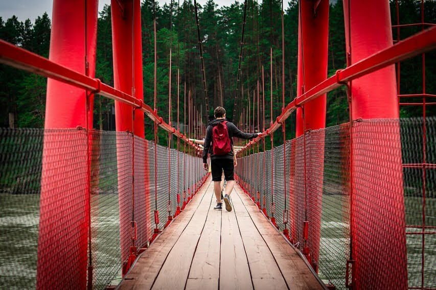 Самый длинный и самый раскачивающийся мост на Алтае. Штраф при раскачивании 1000 рублей, но некоторых туристов это не останавливает 🙈 и по этому при прохождении по мосту вы получите не только эстетическое удовольствие, но и небольшую дозу адреналина😅