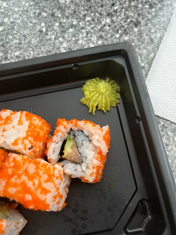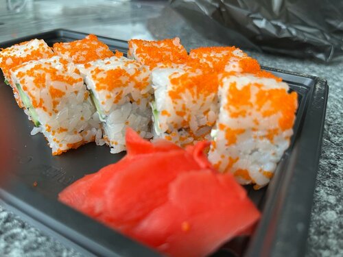 это называется ролл Калифорния за 355 руб Для сравнения, фото с сайта и как оно выглядит по факту… Икры Масаго нет, как будто заказали 30 гр риса и 10 гр огурца