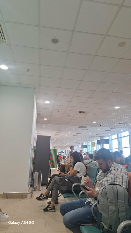 Небольшой аэропорт "Сталинград" Вылета л 09. 09. Досмотр прошёл быстро ,качественно. Наш рейс был один и людей было немного. Всем хватило места. Мало розеток. В целом отлично