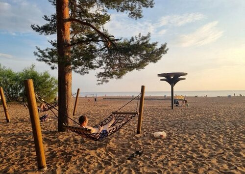 Самый любимый пляж🥰😍❤️! Всегда был хорош, но после ремонта просто шикарный 👍🔥)) Широкая пляжная зона с мелким чистым песком 👍)) Появились несколько мангальных зон, туалеты, души, раздевалки, шезлонги и детские площадки👍)) На территории есть отличный ресторан с видом на залив и несколько ларьков с френч-догами и мороженым😋)) В прошлом году прямо на пляже можно было взять в аренду сап👍)) Добраться можно как на машине, так и на электричке или автобусе от Беговой или Чёрной речки)) Оооочень рекомендую!