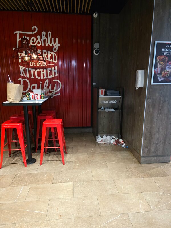 Побывал там во вторник, 18 июня. Отвратительное место. Худшая точка KFC в городе. Очень грязно на столах и внутри, мусорки забиты и не очищаются. Сотрудники постоянно путают заказы, на моих буквально большая часть клиентов приходила менять заказ. Байтсы не были похожи на байтсы, в пакете с ними ещё почему то картофель фри кусочками лежал. Больше туда ни ногой.