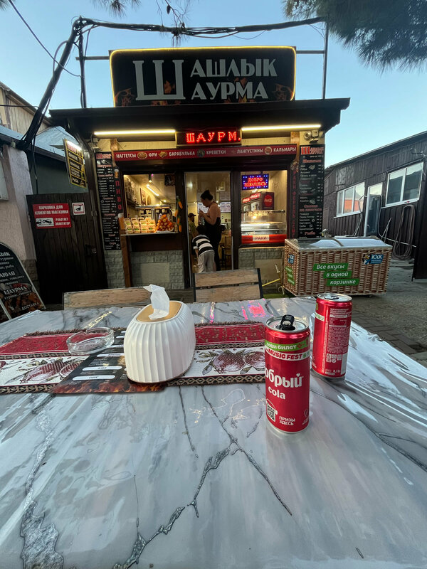 Очень атмосферное, антуражное место. Если вам надоели кафе с персоналом и хочется вспомнить детство, когда родители приводили вас в шашлычку и вы кушали на улице, столы были застрелены клеенкой, а шашлык подавался с шапкой свежего лука, то это то самое место, портал в прошлое. Еда очень вкусная, мы брали шашлык из шеи и картошку на углях. Нам очень понравилось, рекомендую всем, кто хочет вспомнить детство