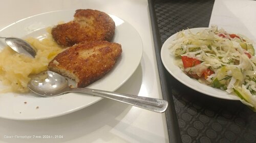 Покушали довольно сносно , просто к вечеру салатики были просолены, пюре соленовато( показался ещё какой то привкус - как будто ещё что-то добавлено ), куриная котлета , капучино (100 или 130 мл за 75₽) При том один повар накладывает одно количество , другой другой ,в итоге не понятно как выглядит порция . В зале работают кондиционеры - можно просто задубеть - у нас так и получилось . Помыть руки - туалет был на обработке - как сказали . Но посетив его спустя очередь из человек 10-15 лужи везде , грязно . Видео людям не интересно соблюдать чистоту. Печалька . Контингент любой и пообщаться и просто поесть и просто посидеть. Нормально.