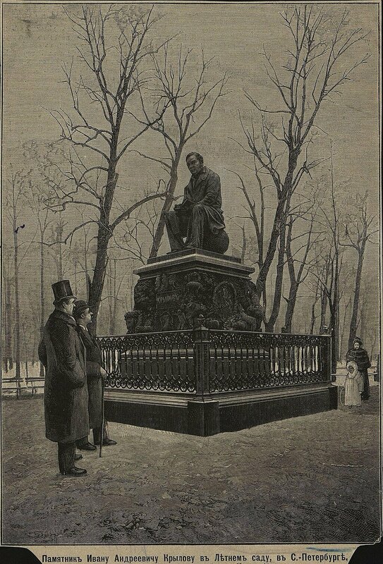 Настоящее произведение искусства. Пару месяцев назад увидел его впервые, посетив великолепный Летний сад. В этом году памятнику исполнилось целых 170 лет. Кого только не видели бронзовые глаза Крылова, какие только события не прошли за это время мимо скульптуры. Большой интерес вызывают животные, герои басен писателя, которые сделаны были по большей части в натуральную величину из свинца и позолочены. Кстати, Летний сад Крылов любил и частенько там прогуливался (или сиживал на скамейке, отдыхая от трудов). С отдыхом в саду связан анекдотичный случай, когда Крылову сильно захотелось в туалет, а бумаги не было. Чем все это закончилось можете прочитать в интернете. Обратите внимание, как памятник выглядел в 19 веке.