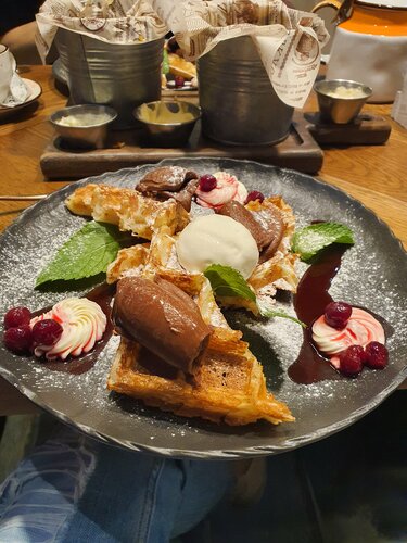 Персонал быстро и хорошо ориентируется по меню, приветливый) Напитки и еда свежие и вкусные, вафлю испекли после того, как я её заказа - это приятно, так как она была свежая и не резиновая. Нутелла на ней была также в достаточном количестве❤️