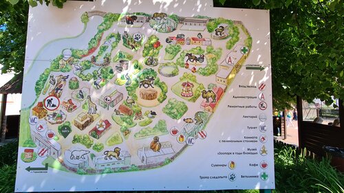 Не ухоженная территория- стройка на стройке. В вальерах трава по шею взрослого человека, детям не видно зверей. Трава и по территории не скошена. Детская площадка, карусели (цены примерно 170р), экзотариум не плохие (все аквариумы находятся на высоте от 90 см. Дети смотрят на цыпочках) Сегодня 16 июня 2022г пришли с дочкой погулять. В итоге в лучшую сторону не изменилось ничего, кроме травы-еще не доросла. Много 'закрыто на реконструкцию' . На территории нет ничего что можно поесть- вата и поп-корн не считается. Кафе на территории просто название, так еще и грязно.