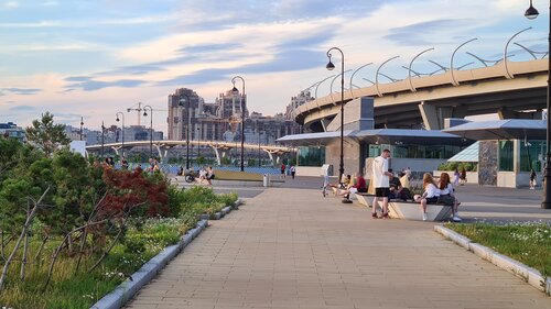 Место посмотреть закат. Вид- сказка! Больше, честно говоря, делать там совершенно нечего. Детская площадка одно название только. Пространство пустое и хилое. Качели- половина сломано и плохо закреплены. Смотровые бинокли- я хохотала)) они пустые внутри!!! Разметки для гонщиков нет! Не понятно где можно ходить, а где ехать- кошмар! Новое пространство -так позиционировали, а по итогу лежаки гравий и чуть травки. Музычка играет, мб какие-то вечеринки будут устраивать, было бы здорово.