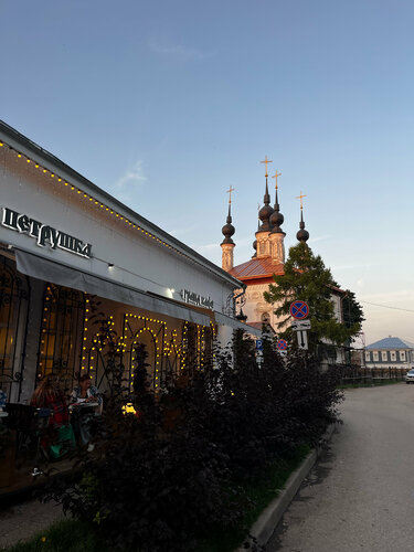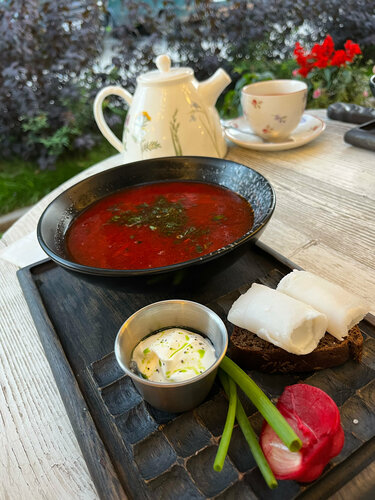 Закрывали лето выходными во Владимире и Суздале. Вечером в субботу пришли на ужин, было музыкальное мероприятие внутри ресторана, всё занято, но хостес даже не догадалась предложить места на веранде, пока мы сами об этом не спросили. Это неприятное поначалу впечатление от ресторана было с лихвой нивелировано вкусным борщом, сервированным сметаной, зеленый луком, маринованным чесноком и бутербродом бородинского хлеба с салом, все как из под ножа! Пожарская котлета на второе с пюре и соусом наподобие бешамель с битым огурцом. Чай был тоже хорош. Порции большие, так что пришлось потом еще променад совершить😁