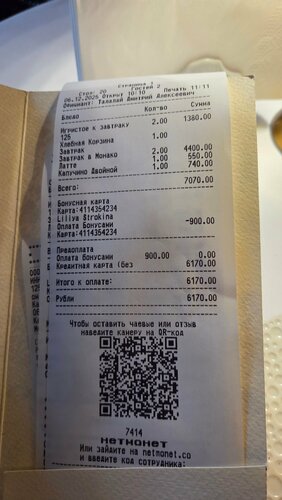 Симпатичный интерьер, качественные, дорогие материалы в отделке. Красивые новогодние украшения: елочки, гирлянды. Внимательное обслуживание На завтрак брали фирменные завтраки IN и OUT. 3 из 5. Кофе тоже очень посредчтвенный. Надпись на дне посуды вообще удивила и обезкуражила. Реклама в Яндексе, что вам начисляется 1000 бонусов - это не совсем так работает. Начисление происходит после оплаты счета.