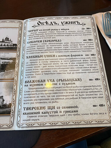 Великолепно! Отличное кафе! Интересный интерьер, стилизованный под купеческий быт! Много фотографий, картины! Интересная мебель под старину! Очень и очень вкусная кухня, особенно из меню «гастротуризма»! Много блюд Тверской кухни!чистота! Внимательный и вежливый персонал! Нас обслуживал Михал,не много скромный молодой человек, но подробно знающий все меню! Брали похлебка Тверская, закуска Боярская, котлета Пожарская, жареха с судаком, мневый пирог - все вкусно! Готовят не быстро, зато все из под ножа! Спасибо персоналу! Шеф-повару респект!