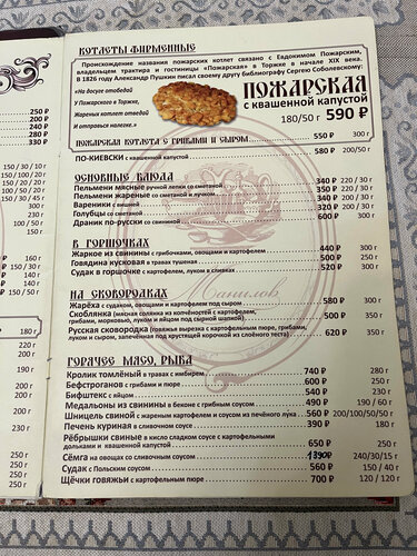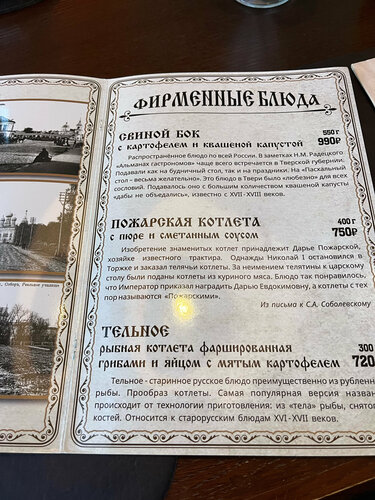 Одно из лучших кафе в центре Твери! Отличное и вкусное меню с местной кухней! Пожарская котлета, тельное и рыбник -все очень и очень вкусно!!! Порции довольно приличные- на двоих хватило вполне! чистота, добродушный и вежливый персонал! Цены очень приемлемы!Спасибо всему персоналу, за предоставленное удовольствие! Шеф-повару отдельное и огромное спасибо за фирменные блюда!!!