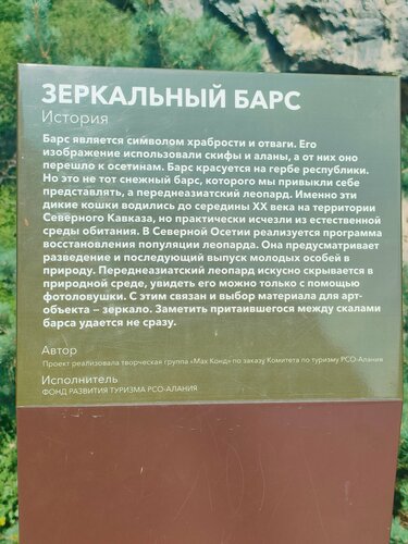 Одна из самых доступных и живописных достопримечательностей Северной Осетии – Кадаргавский каньон.Высота его достигает 60 метров, а ширина всего несколько метров. На скалах каньона притаился зеркальный снежный барс. Арт-объект "Зеркальный барс"- дикая кошка из бетона, покрытая зеркальными пластинами, стала настоящим украшением каньона. Каньон, или теснина, находится в Куртатинском ущелье между горами Тбаухох и Кариухох. Внизу каньона горную породу разрезают мощные потоки реки Фиагдон, которая поделила природную достопримечательность на две части.