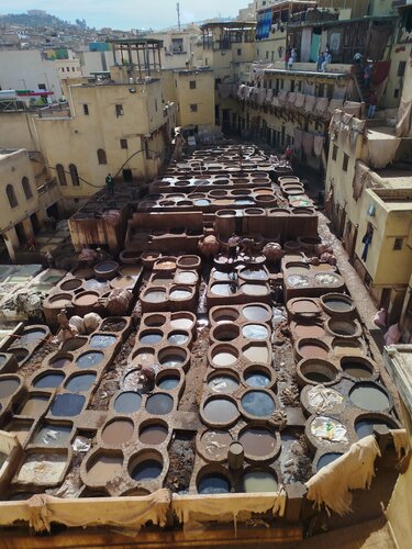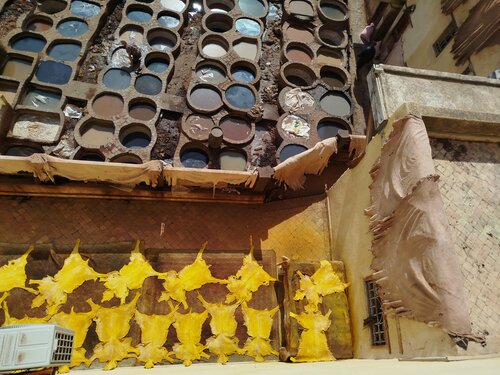 Очень атмосферное место. Вид, который является одной визитных карточек Марокко. На "свежем" воздухе показан процесс обработки шкур для последующего запуска в производство: отбеливание, окраска и прочее. Вонь от процесса еще та, поскольку для выбеливания используется голубиный помет. Для особо чувствительных особ, при входе, выдается пучек мяты, что бы дышать через него приятной свежестью. Тут же магазин. Очень дорогой, поскольку туристов тьма, что -нибудь, кто-нибудь да купит. Дорого, даже после свирепого торга. Лайфхак - за углом уже в 2-3 раза дешевле.