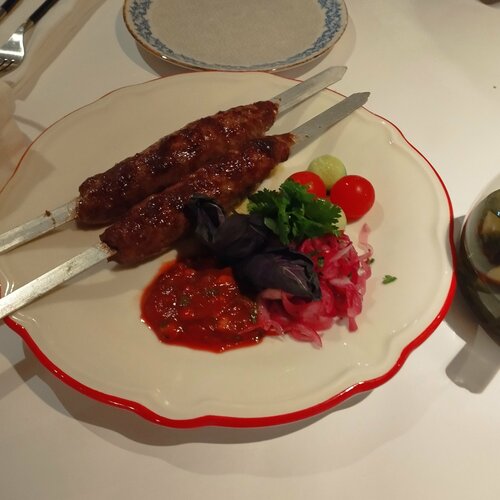 Давно хотел посетить данное заведение. Очень понравился интерьер. Ресторан сам не большой. Примерно на 30 человек по посадке не больше. Очень уютный, мне такие нравится. Читал в комментариях что долго выносят заказ. Я такого не заметил баклажаны принесли в течении 5 минут. Горячие максимум минут 15. Хинкали мне понравились очень ароматные, в фарше много зелени. Тесто достаточно тонкое. Есть конечно не большой минус. Мало бульона в самом хинкалях. А вот кебабу нет вопросов. Отличное нежное мясо! Хотел бы отметить еще шоты. Очень вкусные, подают из теплыми.
