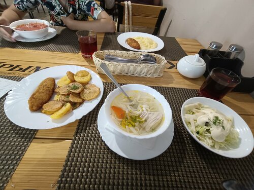 Достоинства: + Быстрое обслуживание, вежливые официанты; + Чистенько; + Оплата картой и наличными; + Вкусные первые блюда, котлеты, компот; + Месторасположение (5-6 минут до набережной и 2-3 минуты до центральной улицы Горького). Недостатки: - Позиционируется как "семейное кафе", а на самом деле интерьер и само заведение как наливайка/пивная; - Неудобные, жёсткие стулья; - Из перечня десертов, представленных в меню, по факту ничего не было в наличии; - Заявленного в меню куринного шашлыка не было в наличии; - Обычные пельмени в меню были просто "золотыми", судя по их цене; - Картофельное пюре оказалось как порошковое, не вкусное; - Чек средний/выше среднего. Если других вариантов нет, то можно и сюда зайти пообедать. Но, с тем, что в кафе нет в наличии кучи позиций, заявленных в меню, - с такой "дичью" я столкнулась впервые.