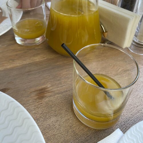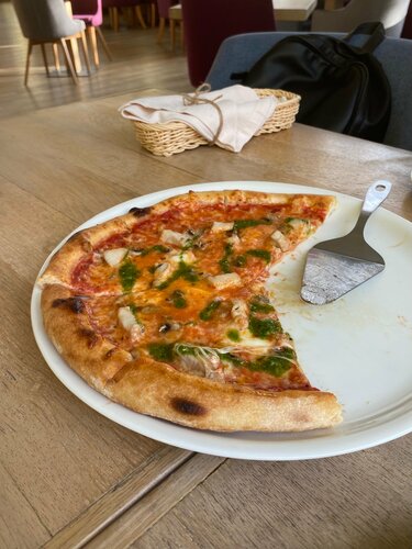 Разбавлю негативные отзывы своим хорошим. Во-первых, конечно, в Зеленогорске не так много ресторанов. Поэтому несмотря на последние отзывы, в которых говорилось, что очень долгое ожидание, мы решили зайти, о чем в последующем ни разу не пожалели. Зал красивый, светлый. Стоит сказать, что с погодой нам тоже очень повезло и было солнечно, что добавляло уюта. Меню небольшое, но есть из чего выбрать. Так как погода прохладная хотелось чего-то горячего. Решили взять два борща и пиццу, а из напитков графин домашнего лимонада. Очень оперативно девушка-официант приняла заказ, рассказала про лимонады, остановились на вкусе персик-лаванда. Напитки вынесли за 5-7 минут, блюда за 15, что достаточно быстро. Всё горячее, очень красивое, а самое главное– очень вкусное. Даже лимонад, который очень редко получается не химозным, был великолепен. Чувствовалось, что сделан на пюре, а не просто на сиропах и отчетливо ощущалась лаванда. Борщ классический, красный, наваристый. К нему кусочек поджаренного хлеба с намазкой из сала и перьями зеленого лука. Всё друг друга дополняло. Пиццу взяли ди-полло. Приятно удивил её диаметр, тесто тонкое, начинка очень вкусная. Посидели, кайфанули, оплатили счет и пошли гулять дальше. За всё про всё отдали 2700 на двоих. Для ресторана - адекватно. Были в будний день. Единственный минус – нет онлайн-чаевых, но ничего, нашли и наличные)