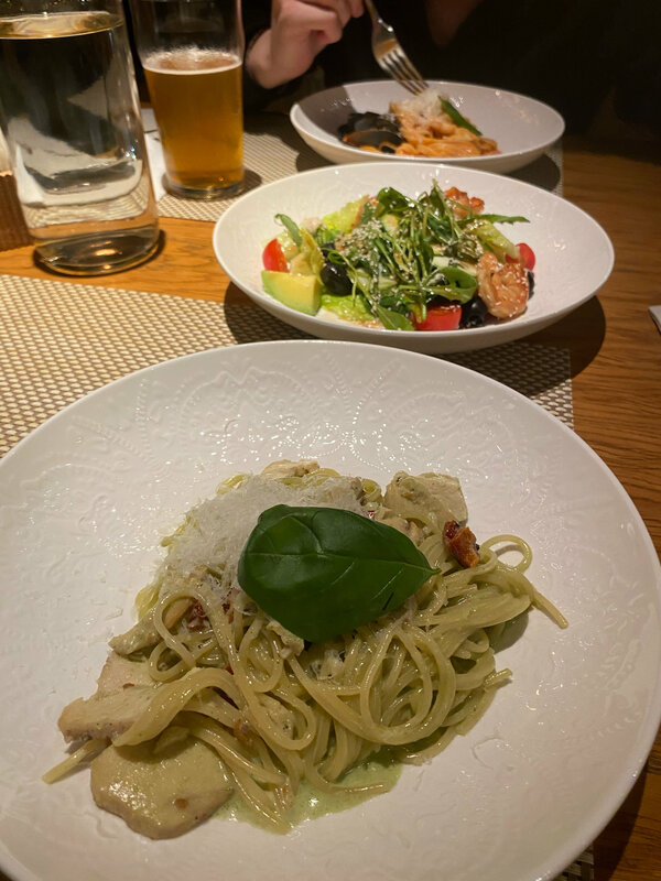 Очень вкусно, брали обе пасты, португальский салат и два пива. Вышло около 2500. Единственное, что напрягло - это коричневые кресла, слишком уж низко сидеть для такого высокого стола.
