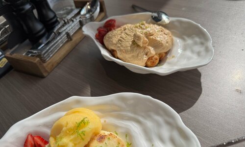 Зашли на завтрак после прогулки по набережной. Персонал дружелюбный, ценник норм. Сами завтраки можно комбинировать или выбирать готовый вариант. Приятный бонус - бокал шампанского! Испортили впечатление невкусные сырники и совершенно невнятные, с ужасной подачей творожные пончики. Это провал.
