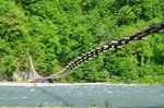 На момент посещения мной этого места, а это 21 мая 2023 года. Мост находится в аварийном состоянии, начало моста по сути не является ходибельным, но рядом приставлена чья-то лестница которая все-таки позволяет туда подняться. Доски гнилые и опираться на них черевато падением вниз, остаётся только всеми силами опираться на металические канаты на которых и висят эти гнилые деревяшки. Я на свой страх и риск дошёл до середины моста и развернувшись успешно вернулся, но если вы не заядлый любитель турников и экстрима не советую. А вот природа которая окружает этот мост просто чудесна, шумная речка и живописная природа вокруг завораживают.