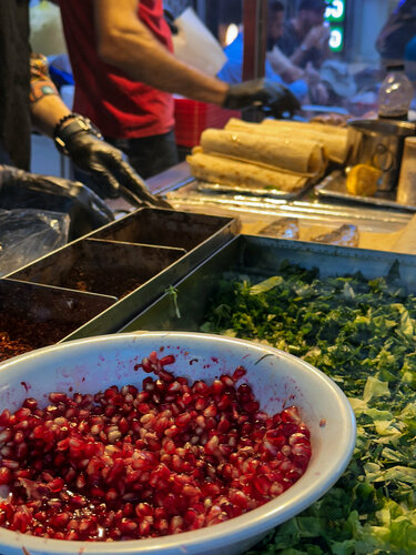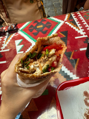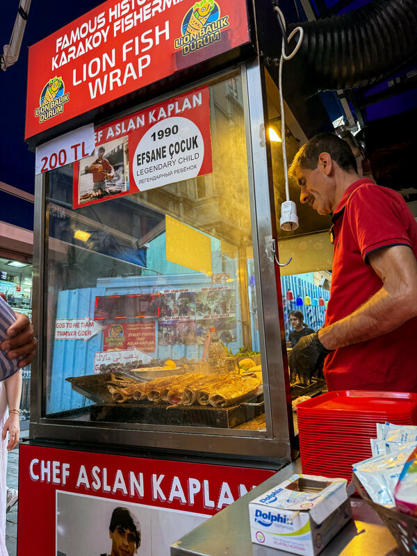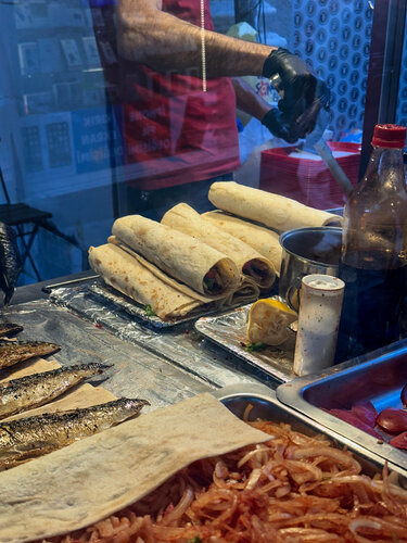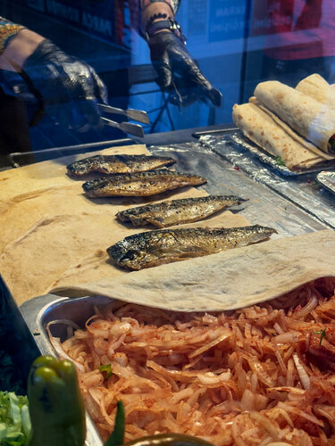 Один из главных гастрономических символов города является балык дюрюм. Простое уличное блюдо, но со вкусом, который невозможно забыть. Мы услышали о нём от местных, что “надо попробовать у Lion Balık Dürüm, там лучший в городе”. И вот мы стоим у крошечной лавки в Каракёе, прямо у пристани. Воздух пропитан ароматом жареной рыбы и лимона, над водой кричат чайки, а где-то за спиной звенит Галатский мост. Настоящий стамбульский саундтрек. Повар сворачивает горячий лаваш, добавляет свежие овощи, зелень, фирменный соус… и вдруг — гранатовые зёрна! Хозяин с улыбкой сказал, что это “его секрет”. Вкус был яркий, свежий, с лёгкой кислинкой, а рыба — сочная и нежная, будто только что выловленная из Босфора.