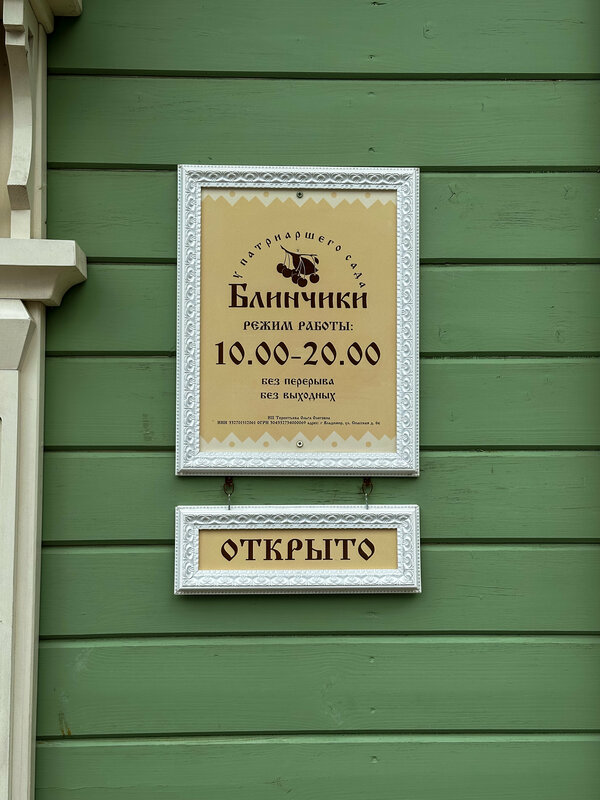 У нас существует небольшая традиция по приезду во Владимир. Каждый раз, как только оказываемся в этом городе - ноги сами несут нас к водонапорной башне. Там, в двух шагах, прячется небольшое кафе с простым названием «Блинчики». С виду — ничего особенного: пару столиков, высокие табуреты, маленький зал. Но стоит зайти, как становится тепло и уютно. И душевно. В меню, естественно, только блинчики. К ним предлагается более 25 начинок на любой вкус: как сладких, так и сытных. Одно из самых популярных: блинчики с вишневым вареньем (Владимир всё-таки считается родиной вишни). Мы каждый раз выбираем что-то новое, но блины неизменно огромные, горячие и вкусные. Садимся за стол у окна с видом на ту самую башню и Патриарший сад. И каждый раз — без исключений! — начинается дождь. Словно по команде. Ты сидишь с горячим блинчиком в руках, смотришь, как стекло покрывается каплями, как небо за окном из голубого превращается в стальное. И в этот момент тебе хорошо и вкусно. Средний чек за двоих: около 1 000 руб.