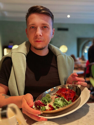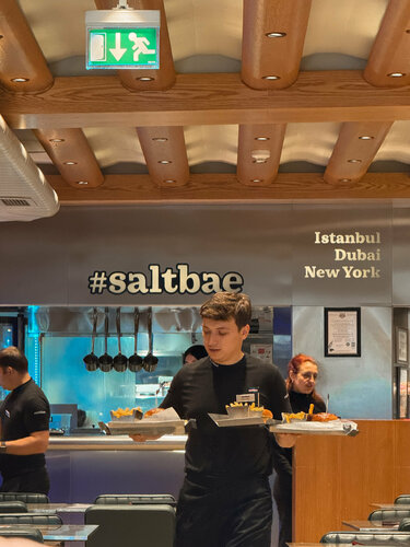 Помните повара, который эффектно посыпает мясо солью, отведя руку в сторону, словно дирижирует оркестром? Да-да, того самого Нусрета, ставшего мемом и легендой в одном лице. Помимо своих люксовых мясных ресторанов, он запустил и более демократичный проект — Saltbae Burger. Мы наткнулись на филиал в Галате, буквально в паре минут ходьбы от башни. Атмосфера — стильная, с ноткой шика: чисто, современно, без толп и суеты. В меню — разные виды бургеров, стейки и закуски, но фишка остаётся та же: красивая подача, сочное мясо и фирменный жест с солью, который официанты повторяют с улыбкой. Так как я уже поела рыбный бутерброд, надо было накормить своего мужчину фирменным Saltbae Burger. Его подают на металлическом подносе, с хрустящей картошкой фри в металлическом тяжелом ведерке — все по канону “индустриального люкса”. У нас несколько раз спросили точно ли я не буду кушать, а на Кирилла смотрели как будто он абьюзер который не дает своей женщине еды. Но картошку фри я все таки у него попробовала! Булочка мягкая, но не разваливается, мясо — сочная прожарка, глубокий вкус, правильные специи, а соус идеально дополняет всё это сочетание. Однако... на самом деле, мы пробовали бургеры и повкуснее. Этот вкусный, ничего не скажу, но какой-то изюминки в нем, за свою стоимость, мы не нашли. В целом подаче это похоже на Black Star Burger, но без хаоса, липких столов и очередей. Если хочется попробовать бургер “с историей” — тем более от самого “Salt Bae” — загляните в Saltbae Burger Galata.